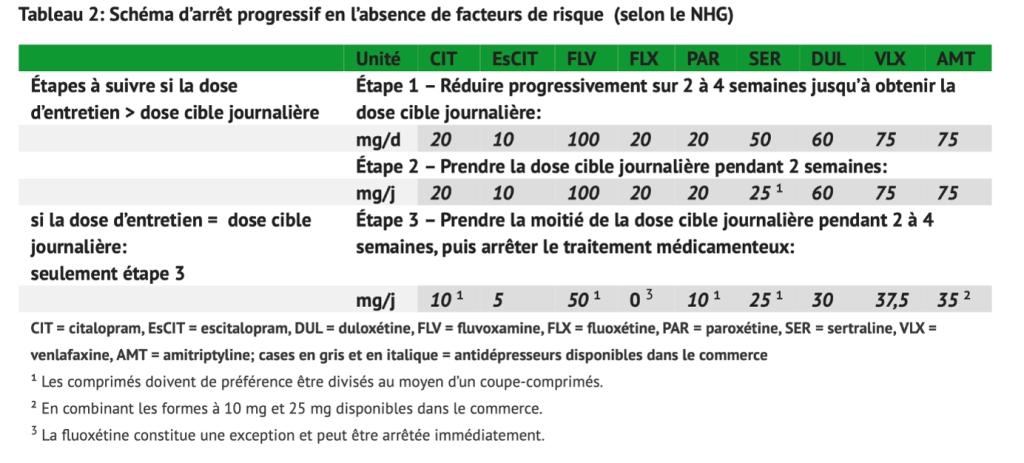 Comme pour tout autre processus du sevrage, l’entretien motivationnel et la psychothérapie soutiennent le patient dans son effort. Les doses d’antidépresseur seront réduites progressivement, sur une période d’au moins un mois et par paliers d’au moins une semaine. La durée des paliers et la vitesse de diminution des doses sera adaptée au patient et au type d’antidépresseur. Le patient sera revu au minimum 7 à 10 jours après chaque réduction de dose. En cas de mauvaise tolérance, le patient reprendra la dose précédente bien tolérée et le médecin exclura l’hypothèse d’une rechute dépressive.