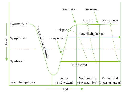 Het verloop van een depressie wordt meestal beschreven a.d.h.v. de 5 R’s (zie Figuur 1): ‘response’, ‘remission’, ‘recovery’, ‘relapse’ en ‘recurrence’. Op de verticale as staat de gemoedsstemming van de patiënt. Als de depressie vordert, zakt de gemoedsstemming. De behandeling start op het diepste punt in het dal. Naarmate de behandeling start, verbetert het gemoed. Er is ‘response’ (duidelijke verbetering van de patiënt). Van ‘remission’ is pas sprake als de patiënt geen symptomen meer heeft. Een niet volledige afname van symptomen wordt ook partiële remissie genoemd. Van ‘relapse’ wordt gesproken als binnen 4 - 6 maanden na remissie de klachten opnieuw optreden. Een ‘recurrence’ is het optreden van een nieuwe ziekte-episode. Er is sprake van ‘recovery’ als de patiënt herstel vertoont gedurende 4 - 6 maanden.