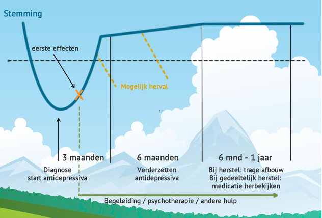 Uit de praktijk is gebleken dat naast het ‘acute effect’ van een antidepressivum (d.w.z. een afname van de depressieve symptomen in de eerste weken van de behandeling), veel antidepressiva ook op langere termijn leiden tot een afname van de ervaren klachten. In de NHG-‑Standaard ‘Depressie’ wordt mede daarom ook geadviseerd om bij een positief ervaren effect zeker zes maanden door te behandelen met het antidepressivum van keuze nadat remissie (vermindering van de klachten) wordt bereikt. Ook vermindert een onderhoudsbehandeling met antidepressiva het risico op terugval. Hierna kan de behandelend arts met de patiënt de voor- en nadelen van het continueren van de behandeling bespreken. Hierbij moet ook het risico op het doormaken van een terugval worden besproken. Het afbouwen van antidepressiva is nl. niet geheel zonder risico (zie hoofdstuk 8).
